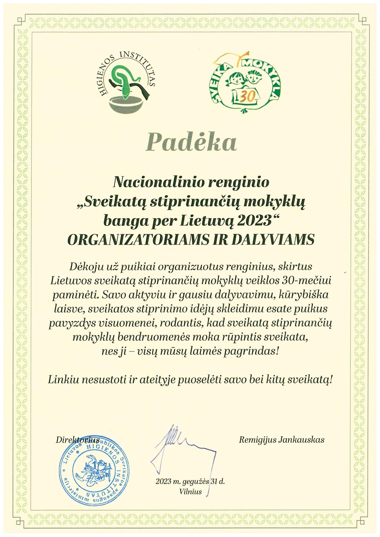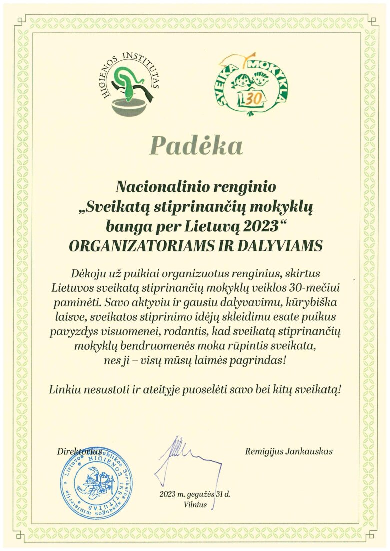 Padėka gimnazijai už dalyvavimą nacionaliniame renginyje